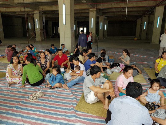 Người dân buộc phải ngồi nằm la liệt ở khu vực ghế đá, bãi cỏ và hành lang xung quanh khu vực chung cư. Do vội vàng tháo chạy thoát thân trong đêm, hầu hết không ai mang theo được bất cứ tài sản gì. May mắn, nhiều đơn vị đã kịp thời tiếp tế miễn phí thực phẩm, quần áo, giày dép cho người dân.