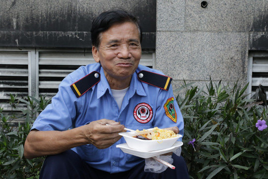 Bác bảo vệ vui vẻ đón phần cơm miễn phí trong cơn đói.