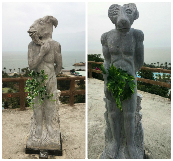 Sự việc hài hước tượng 12 con giáp ở TP Hải Phòng tiếp tục gây sốt dư luận. Sau màn mặc quần cho tượng 12 con giáp để che đi chỗ nhạy cảm. Mới đây công ty cổ phần du lịch quốc tế Hòn Dáu thay thế quần bằng lá cây, chùm nho giả cho tượng 12 con giáp có hình thù kỳ quái.