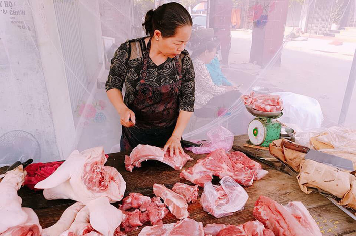 Old  Default Cô bán thịt heo quây màn tuyn quanh bàn thịt để tránh ruồi