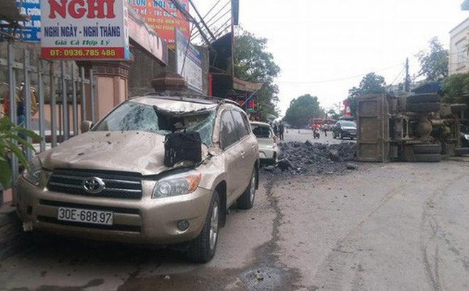Sau cú “bẻ lái” gấp, xe tải của ông Tiến va chạm với hai xe đang đỗ ở vỉa hè và lật nghiêng, đá đổ tràn ra đường.