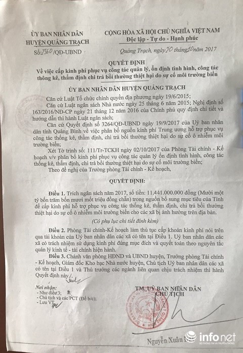 Quyết định chi trả kinh phí cho các xã khắc phục môi trường biển. Ảnh: Infonet