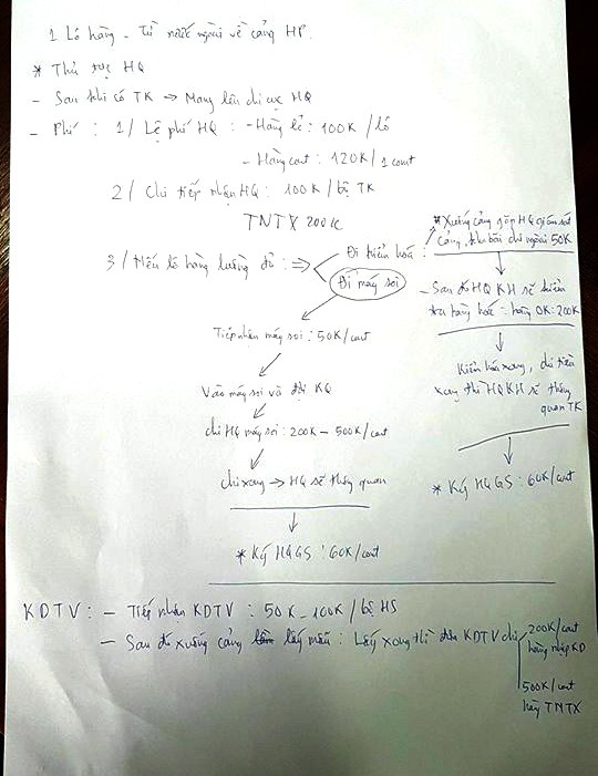 Theo nội dung tờ giấy được Dũng ghi chú, khâu nào “đụng” hải quan thì khâu ấy đều mất tiền “bôi trơn“.