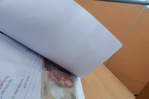 Tiền được kẹp trong hồ sơ để chuẩn bị "bôi trơn". Ảnh: PV.