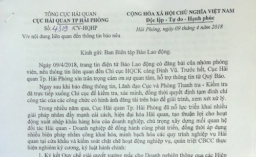 Công văn văn Cục Hải quan Hải Phòng gửi đến Báo Lao Động về nội dung liên quan đến hành vi tiêu cực, được báo chí phản ánh.