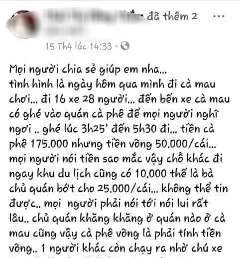 Theo đó, cộng đồng mạng "dậy sóng" bởi bài đăng được bắt đầu từ trang cá nhân của một thành viên đoàn phượt có tên H.T vào ngày 15.4. Cô gái này cho biết, đoàn phượt 16 xe, 28 người có ghé vào một quán cafe ở bến xe Cà Mau vào lúc 3h25 ngày 14.4, ở lại khoảng 2h thì rời đi. Cả đoàn uống nước hết 175k (175.000 đồng), tiền võng 50k (50.000 đồng)/cái, sau đó được bớt xuống 25k (25.000 đồng)/cái. Tổng cộng hơn 400k (400.000 đồng).