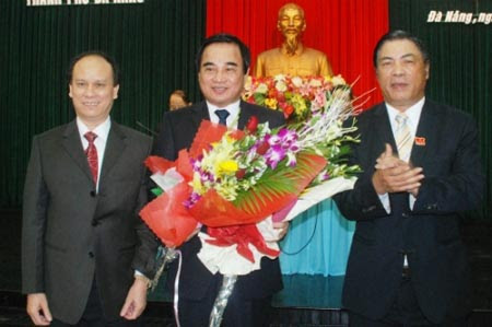 Ông Văn Hữu Chiến (ở giữa) nhận hoa chúc mừng trúng cử Chủ tịch Đà Nẵng của ông Nguyễn Bá Thanh và Trần Văn Minh. Ảnh: Đình Thiên
