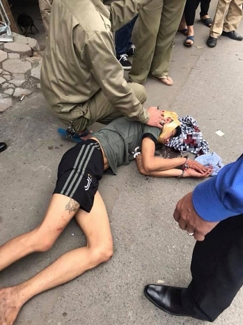 Hình ảnh nam thanh niên tự đập búa vào đầu mình rồi gục xuống đường được người dân ghi lại