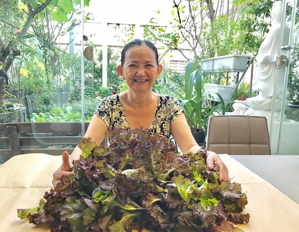 Mẹ chị Hiền bên nông phẩm vừa thu hoạch từ khu vườn sân thượng.
