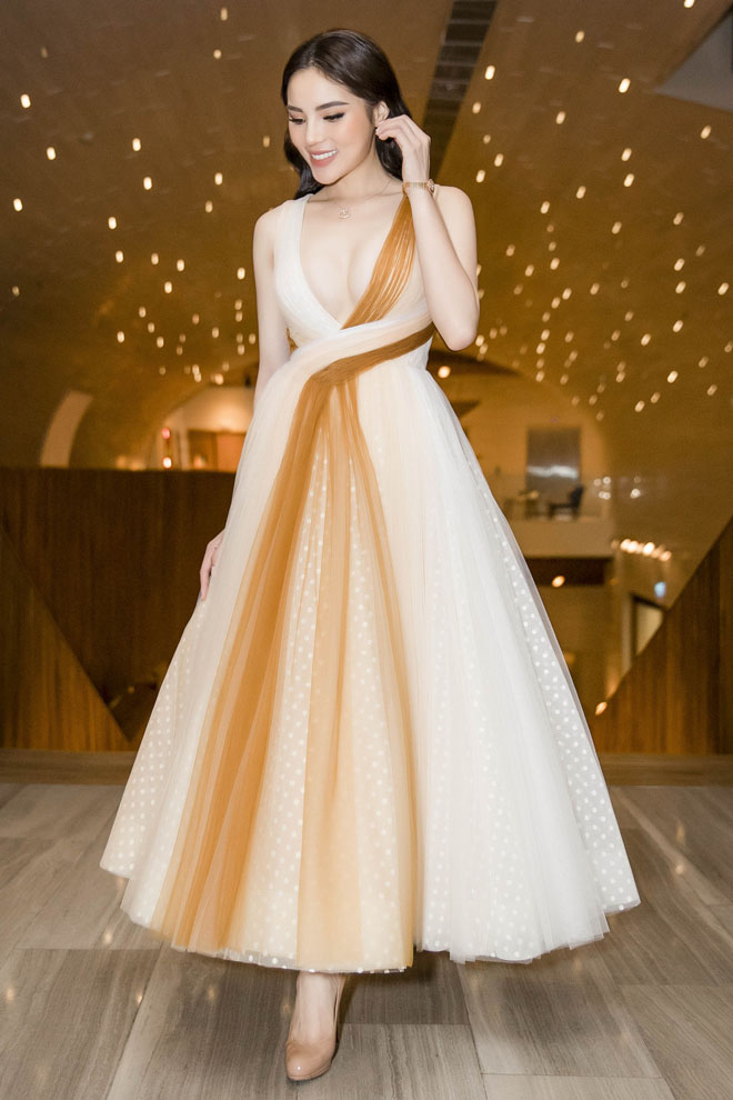 Tối qua (3.5), Hoa hậu Kỳ Duyên là khách mời đặc biệt của một sự kiện tại Sài Gòn. Người đẹp gây chú ý khi xuất hiện trong trang phục của NTK Lê Thanh Hòa. Bộ váy cắt xẻ táo bạo tôn vinh nét đầy đặn, giúp Kỳ Duyên cuốn hút, gợi cảm nhưng không kém phần lộng lẫy. Để tăng thêm phần hoàn hảo, Kỳ Duyên đeo thêm trang sức xa xỉ Chopard có giá 1,2 tỷ.