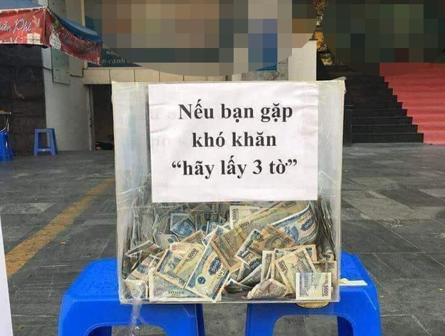 Nhiều ngày qua, nhiều người đi qua đường Tô Hiến Thành, phường 15, quận 10 sẽ nhìn thấy một thùng đựng tiền khá đặc biệt. Thùng tiền đặt ở vỉa hè, trên thùng có in dòng chữ: "Nếu bạn gặp khó khăn, hãy lấy 3 tờ". Trong thùng toàn là tờ 5.000 đồng.