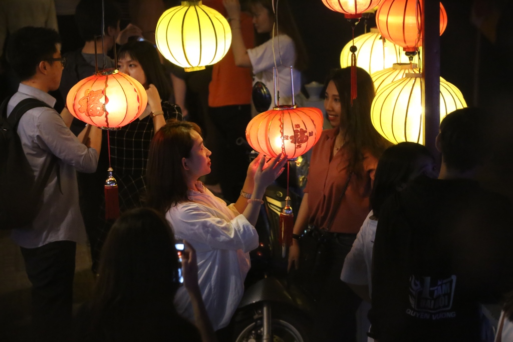 Nhiều bạn trẻ tranh thủ tạo dáng bên dòng kênh lung linh ánh sáng hoa đăng và lồng đèn