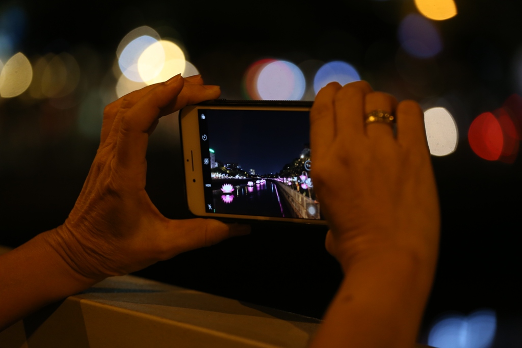 Nhiều người đứng dạo mát bờ kênh và ghi lại những khoảnh khắc đẹp