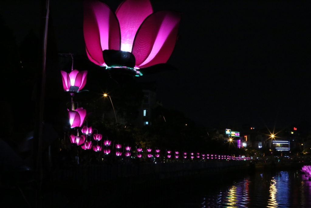 Dọc bờ kênh, nhà chùa cũng tổ chức treo đèn hoa đăng trong dịp lễ Phật đản