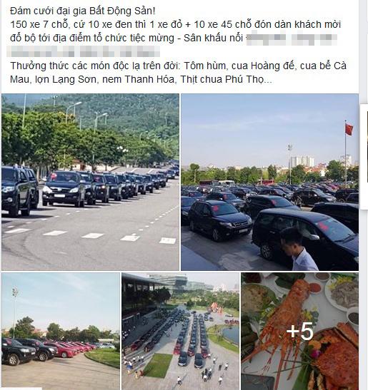 Mới đây, hình ảnh một đám cưới được cho là của đại gia bất động sản với đoàn đón dâu vô cùng hoành tráng diễn ra ở ngoại thành Hà Nội được đăng tải trên mạng xã hội. Tuy nhiên, điều khiến người ta choáng váng không phải là hàng trăm chiếc xe đón dâu, hay có hẳn một sân khấu nổi trên hồ ở một khu du lịch, mà cỗ cưới mới chính là điểm gây chú ý.