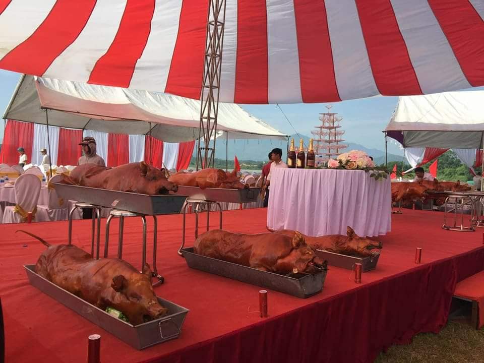 Hàng chục con lợn quay có trọng lượng lớn được chuẩn bị cho cỗ cưới