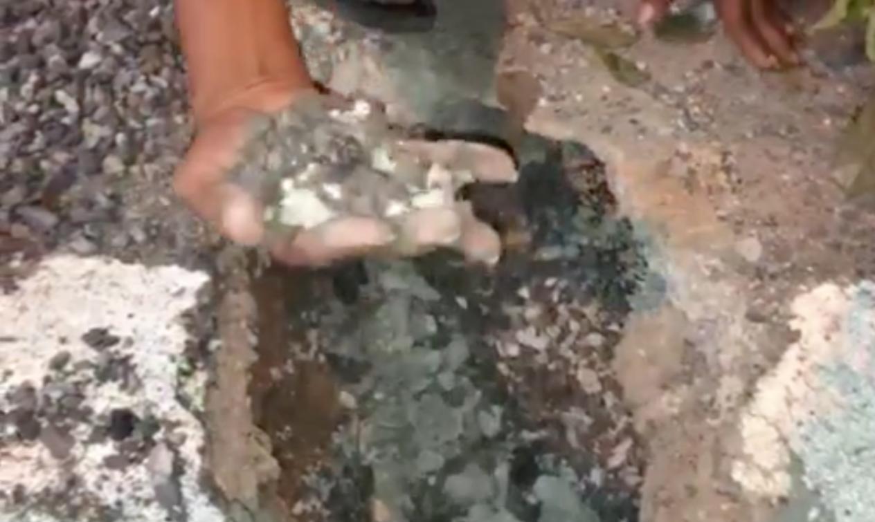 Có mặt tại hiện trường, ông Trần Văn Tuấn, người dân xã Mỹ Tân, dùng tay bẻ từng miếng nhựa lát mặt cầu dễ dàng như bẻ các tấm xốp rồi ông bốc từ hố sụt lên từng vốc cát đá, nơi lẽ ra phải là bê tông.