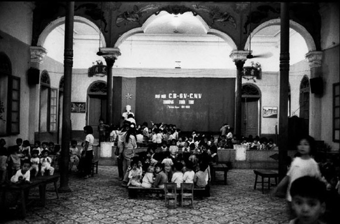 Trong hình là một buổi họp mặt của các em thiếu nhi tại trường mầm non Tuổi Thơ trên phố Hàng Buồm. Đây cũng là hội quán Quảng Đông của người Hoa quanh khu vực.