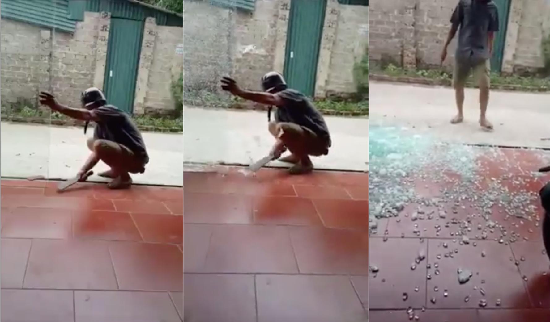 Theo những diễn biến trong đoạn clip, thanh niên nhân vật chính tay lăm lăm chiếc dao rựa, tay còn lại cẩn thận giữ chiếc cửa kính rồi... gõ đều tay. Cứ thế sau chừng 4-5 phát gõ mạnh, chiếc cửa kính vỡ bung, bắn tung toé khắp nhà, thanh niên nhanh nhẹn né thoát thân.
