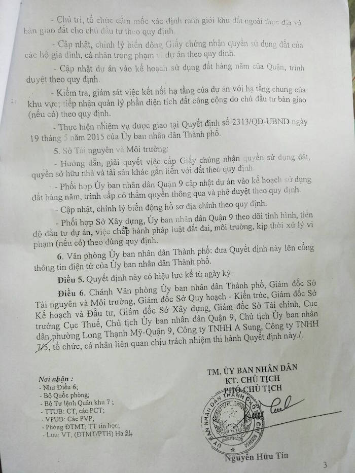 Ông Nguyễn Hữu Tín ký Quyết định 3066/QĐ-UBND về việc “giao đất tại Long Thạnh Mỹ, Quận 9 cho Công ty TNHH A Sung để thực hiện dự án khu dân cư 7/5”