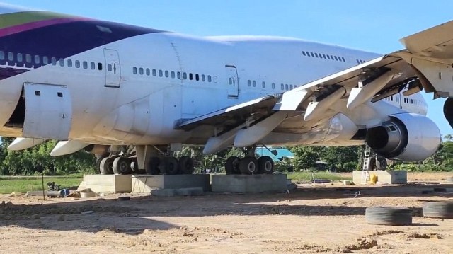 Chiếc Boeing 747 này sơn màu tím và vàng đặc trưng của Hãng hàng không Thai Airways. Tất cả cửa trên chiếc máy bay đều đóng chặt do vậy người dân đã không thể bước vào bên trong chiếc phi cơ để điều tra.