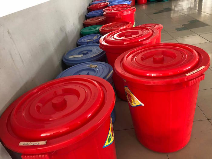 Thùng nhựa đựng các nguyên liệu đã pha chế sẵn theo công thức riêng của chủ quán Kiều Giang.