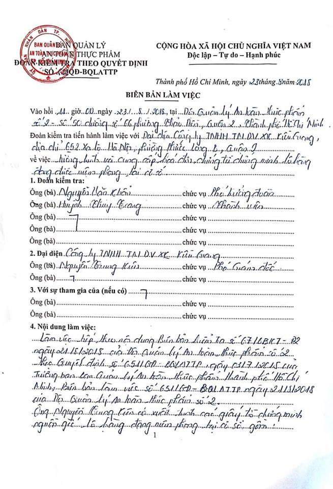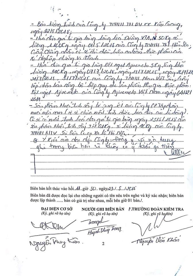 Đại diện của các công ty cung cấp gia vị cho Kiều Giang đồng ý với biên bản của công ty này, có sự chứng kiến của lãnh đạo Đoàn Kiểm tra.