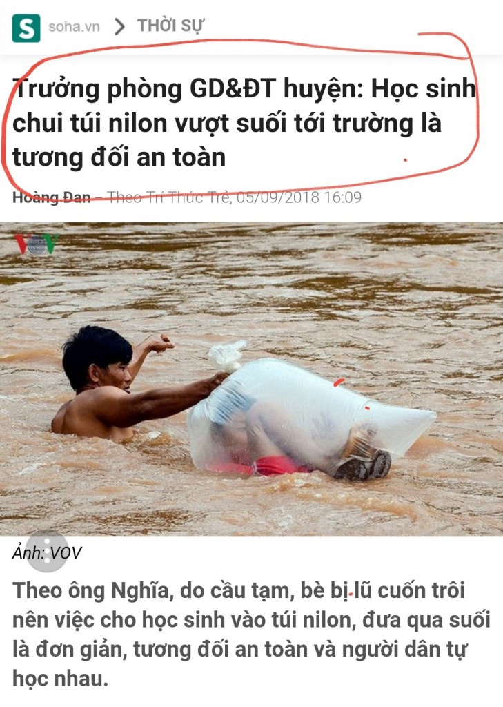 Cộng đồng mạng trước đó lan truyền hình ảnh học sinh chui túi nilon vượt suối lũ đến trường khai giảng. Chánh Văn phòng Sở Giáo dục- đào tạo nói đây là chuyên bịa. Ông này sau đó đã phải gỡ status.