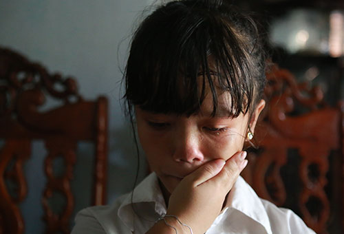Ngồi bên mẹ, con gái đầu Nguyễn Thị Nhung cho biết năm nay bước vào lớp 7 nhưng luôn tự ti về bản thân. “Em lo thân hình của mình như vậy thì sau này sẽ khó tìm được việc làm. Em rất buồn vì hàng ngày không phụ mẹ việc cày cấy...”, Nhung rưng rưng nước mắt nói.