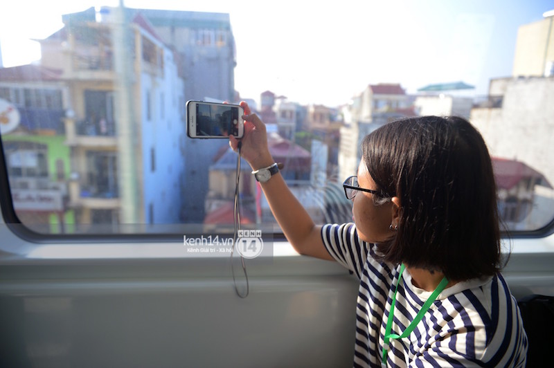Hành khách thích thú lưu lại hình ảnh bên ngoài khung cửa sổ của đoàn tàu.