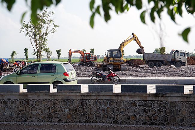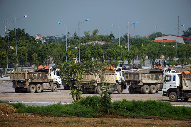 Hàng chục máy móc chuyên dụng và nhiều xe tải lớn làm việc liên tục, gấp rút.