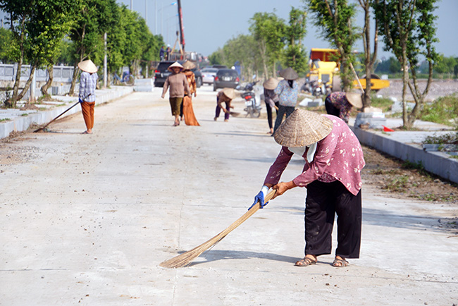Dưới thời tiết nắng gắt, nhiều người dân tiến hành quét dọn vệ sinh những khu vực đã hoàn thành thi công.