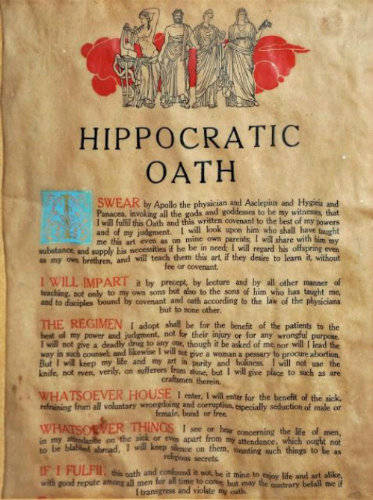 “Tôi tuyên thệ với Apollo, thần chữa bệnh, Asclepius, Hygieia và Panacea, và tôi minh chứng với tất cả các nam thần, các nữ thần, tôi gìn giữ, tùy theo khả năng và thẩm định của tôi, lời thề sau đây: