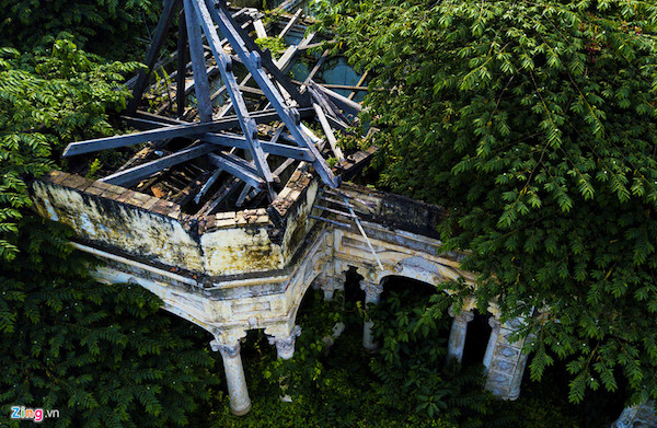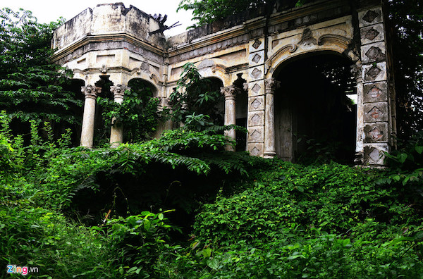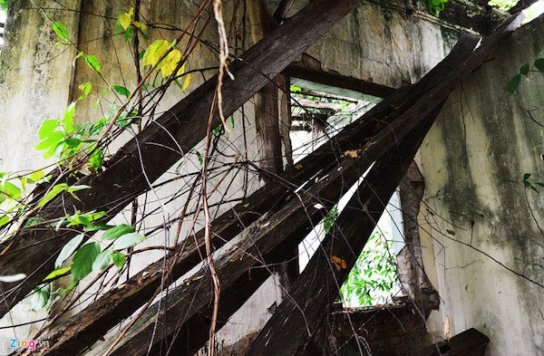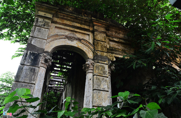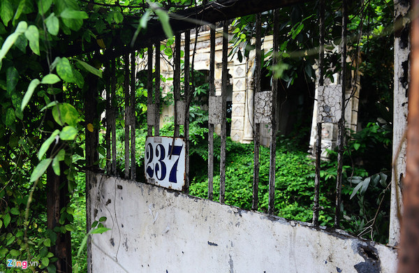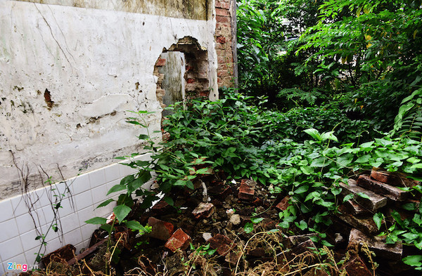 Bờ tường, cột, các họa tiết trang trí hai bên căn nhà còn chưa bị đập bỏ nhưng phần lớn bị những cây trứng cá xum xuê bao phủ.
