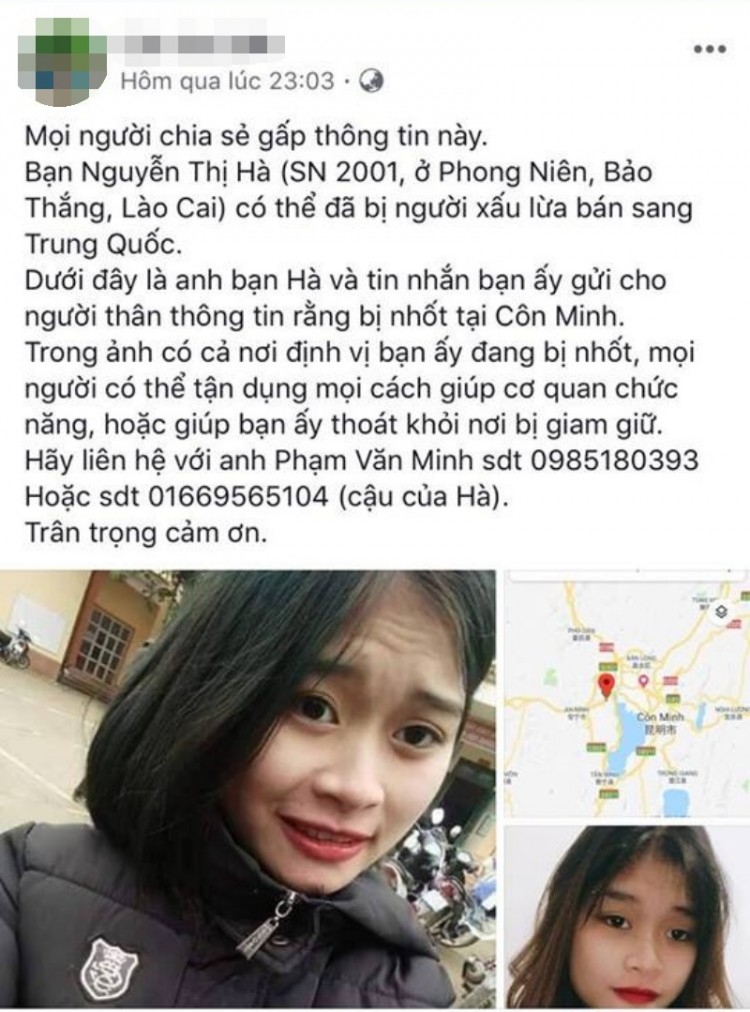 “Gia đình báo Hà bị lừa bắt cóc và bị giam giữ ở Côn Minh, Trung Quốc. Tuy nhiên chúng tôi vẫn phải đợi chỉ đạo từ huyện, đồng thời xác minh thông tin Hà bị lừa, bắt cóc có chính xác không” – ông Đức nói.