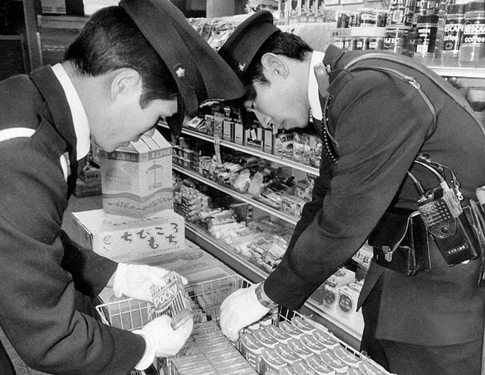 Cảnh sát kiểm tra kẹo chocolate Poky của Glico trong một siêu thị ở Osaka, Nhật Bản, tháng 12/1984. Ảnh: Sankei Archive.