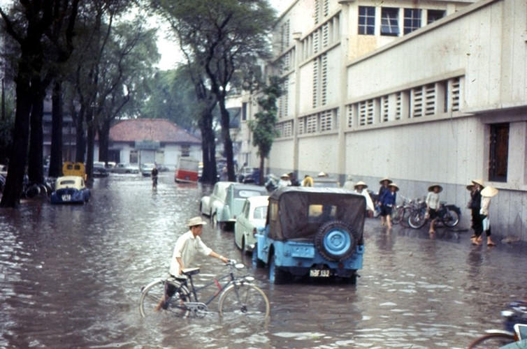 Xe quân sự Mỹ chôn chân trên đường phố ngập nước của Sài Gòn mùa mưa. Ảnh: Thomas Southall.