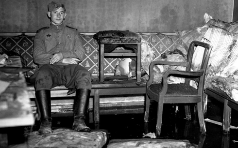 Một chiến sĩ Hồng quân ngồi trên ghế sofa mà gã độc tài Hitler được cho là đã từng ngồi lúc y tự sát. Ảnh: Getty.