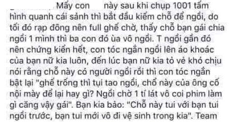 Bạn nữ đó còn thêm câu: “Ba tụi mày đã xấu còn mất lịch sự”. Nghe mà thấy bạn đó hơi không có văn hoá. Tính mình không thích gây sự với ai nên thôi cũng im, chả nói gì. Xong, cô ấy đi chỗ khác thì một hồi sau, bạn trai người đó đến chỉ vô mặt mình, nói tại sao hất tóc vô người bạn gái anh mà không xin lỗi, còn giành ghế, thấy bạn gái anh nhỏ con nên ba đứa mình ăn hiếp hả?