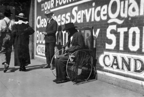 Người ăn xin mù ngồi xe lăn trên phố ở Lawton, bang Oklahoma, 1917. Ảnh: Lewis Hine/Library of Congress.