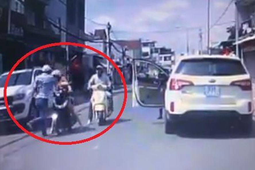 Mặc dù được một phụ nữ khác can ngăn, người đàn ông vẫn hung hăng quay lại xe lấy hung khí đòi đánh người phụ nữ đi xe máy.
