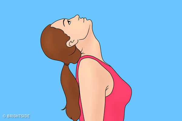 Đứng thẳng, từ từ hướng mắt lên trên, đầu hơi ngửa ra sau. Tiếp đó, giữ nguyên tư thế này trong 15 giây và hít thở sâu. Sau đó, đưa đầu về vị trí ban đầu. Lặp lại động tác 6 lần. Có thể thực hiện vài lần trong ngày.