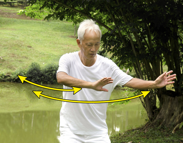 Đứng thẳng, hai chân dang rộng bằng vai hoặc xa hơn. Đưa tay lên trước ngực, lòng bàn tay hướng ra ngoài. Từ từ khuỵu nhẹ gối xuống. Bắt đầu di chuyển hai tay từ trái sang phải và ngược lại. Duy trì hơi thở nhịp nhàng, thực hiện khoảng 2 - 3 phút.