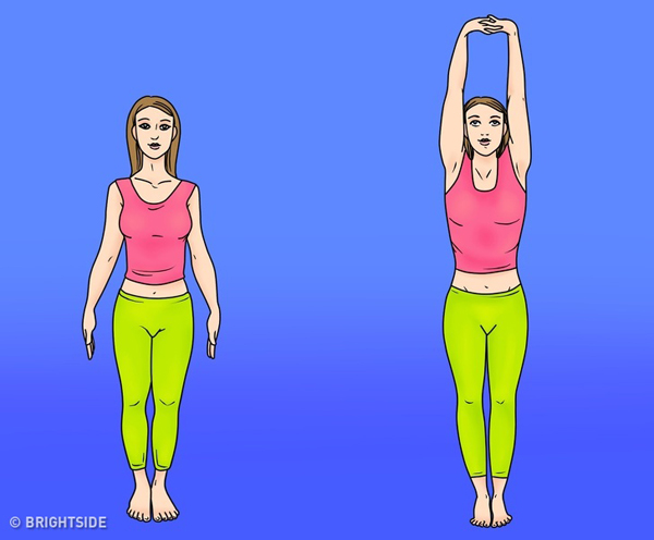 Đứng thẳng, chụm chân, hai tay duỗi thẳng theo thân. Hít vào, đưa hai tay đan vào nhau rồi đưa thẳng lên trên đầu, lòng bàn tay hướng lên trời đồng thời kiễng chân. Thở ra, từ từ hạ thấp người quay về tư thế ban đầu. Lặp lại động tác 6 lần.