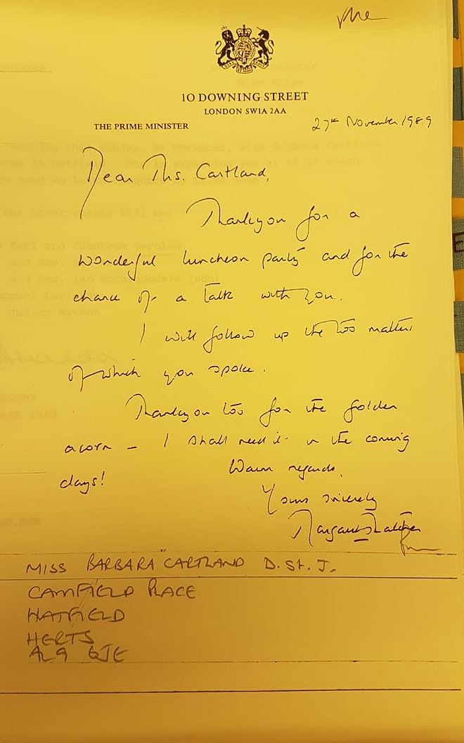 Tháng 11/1989, nữ Thủ tướng có buổi ăn trưa với bà Cartland. Sau đó ít lâu, bà Thatcher gửi cho bà Cartland một bức thư, trong đó viết: “Cảm ơn bà về Quả sồi vàng, tôi sẽ cần đến nó trong những ngày tới”. Quả sồi đó được lấy từ lâu đài của bà Cartland ở Cartland. Cây sồi này nổi tiếng vì do đích thân Nữ hoàng Queen Elizabeth I trồng và bà Cartland tin rằng nó có sức mạnh ma thuật.