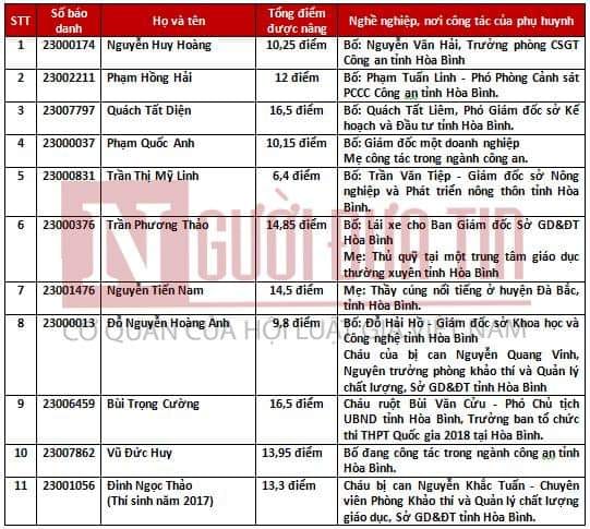 Ngoài ra, có một số thí sinh khác là con em cán bộ lãnh đạo sở, ngành khác của Hòa Bình… Các thí sinh này đã được nâng điểm ít, nhiều tuỳ trường hợp nhưng hầu hết đều đỗ vào các trường đại học uy tín.