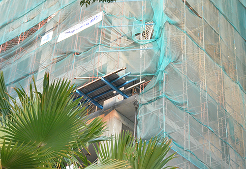 Viên gạch nghi rơi từ toà nhà đang thi công này. Ảnh: Sơn Hoà.