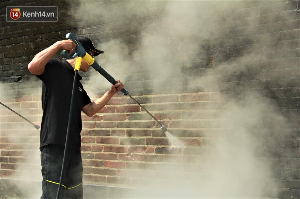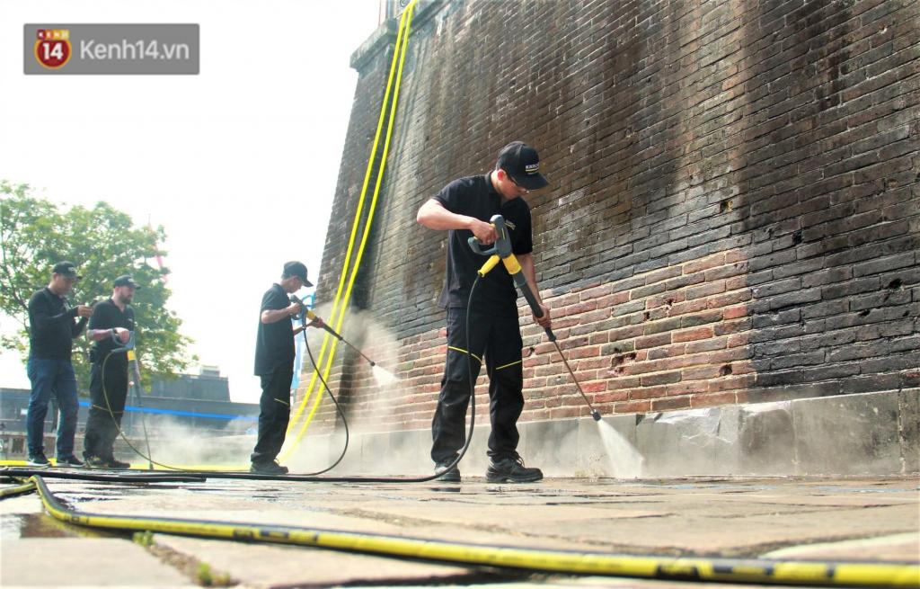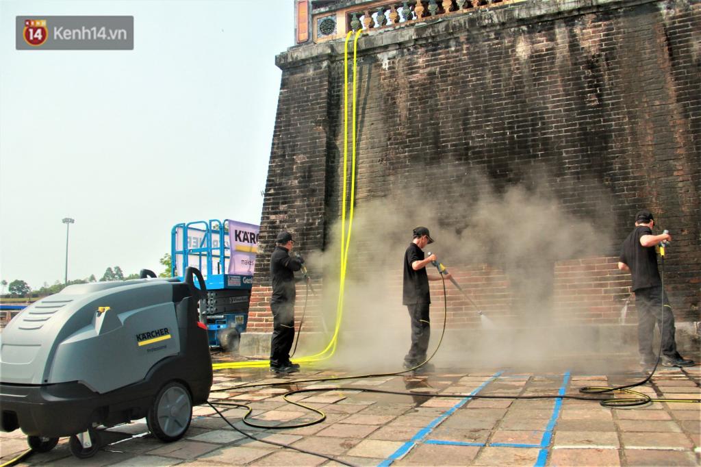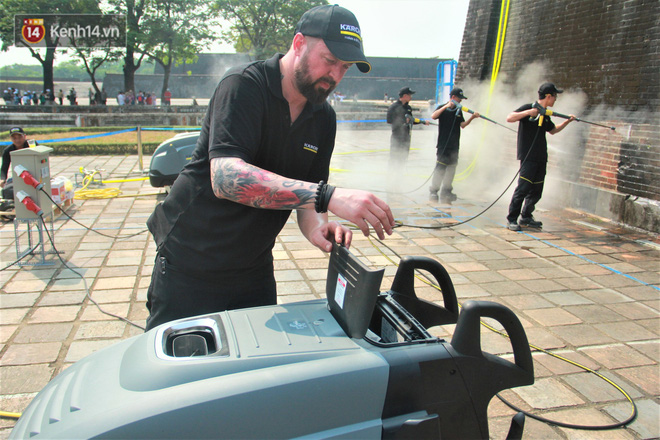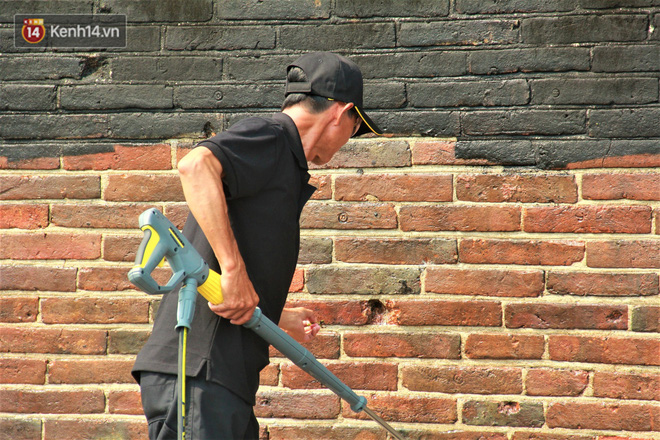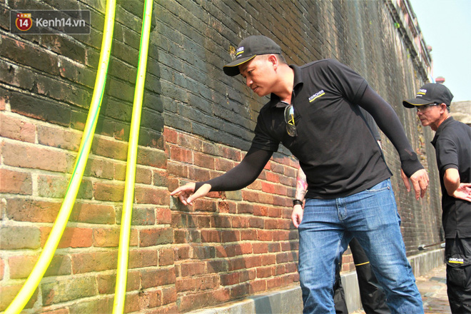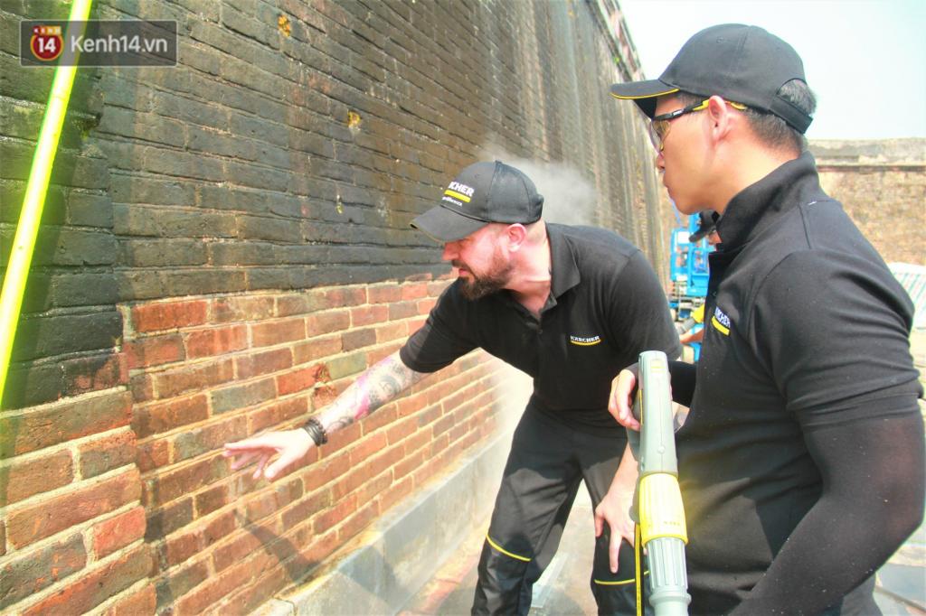 Chuyên gia làm sạch Karcher kiểm tra kỹ càng những chi tiết nhỏ nhất. Khu vực được làm sạch là tường Ngọ Môn, nền lát gạch Bát Tràng dẫn vào trong di tích Đại nội…