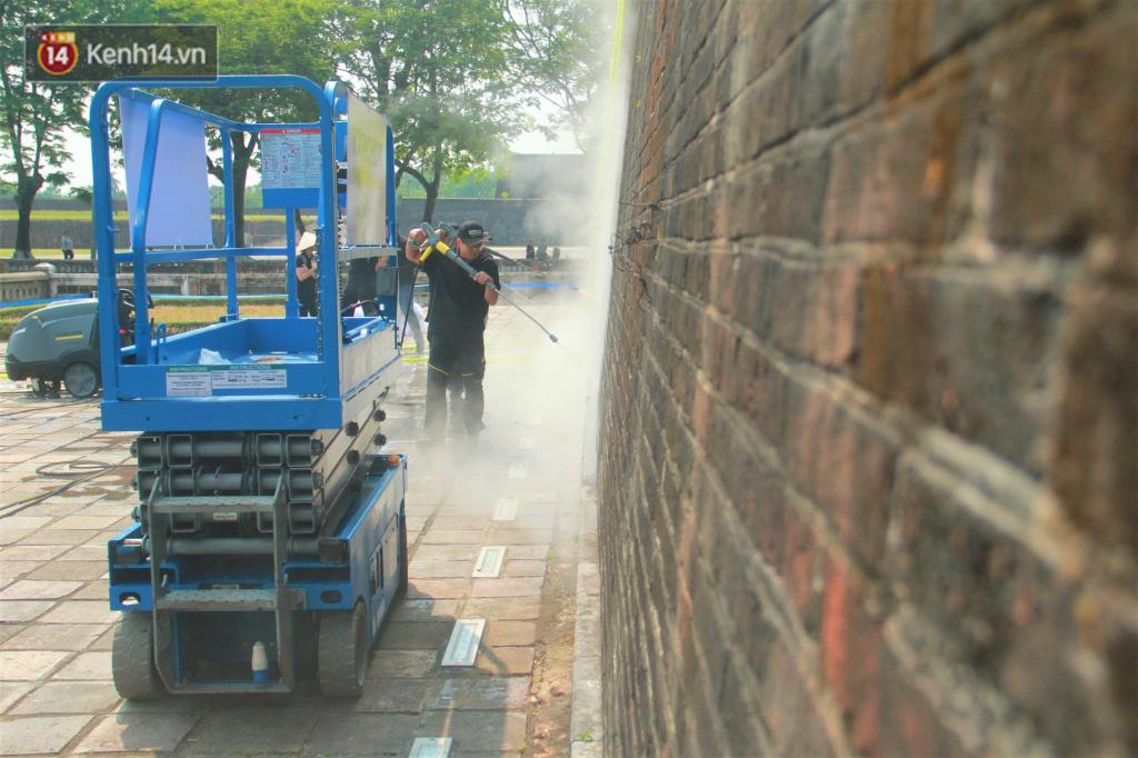 Di tích Ngọ Môn, cửa chính đi vào Hoàng Cung Huế đang hoàn tất những công đoạn cuối cùng của dự án làm sạch bằng kỹ thuật phun áp lực cao ở chế độ hơi nước nóng.