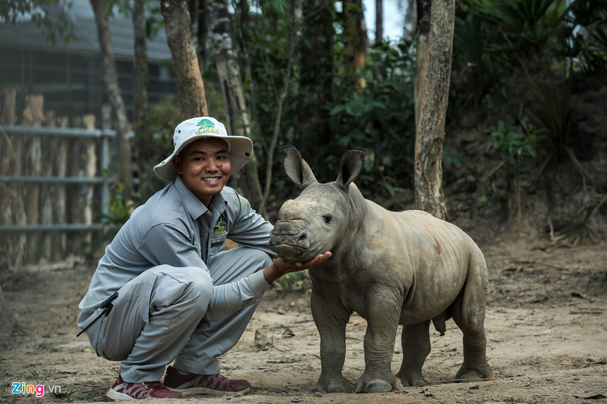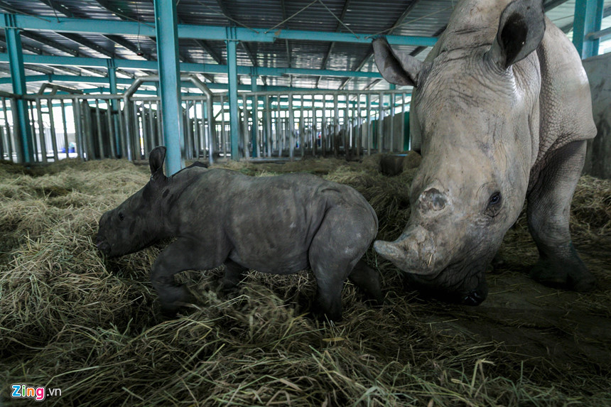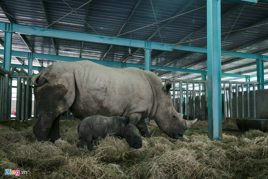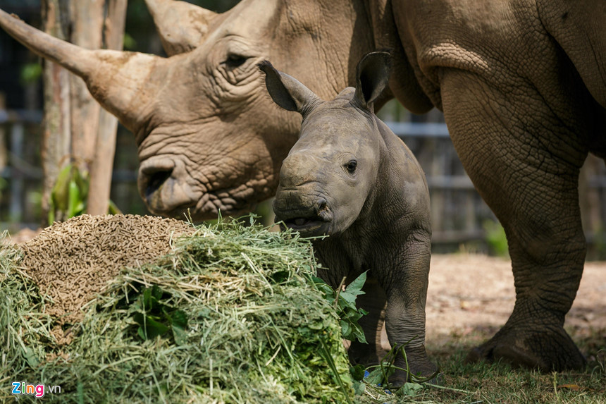 “Tê giác là loài động vật cảnh giác cao độ với môi trường xung quanh, khi mới đẻ, chúng thường để con non lên trước mặt để quan sát. Chỉ khi thấy an toàn tuyệt đối, không còn căng thẳng, tê giác mới để con tự do đi lại”, anh Bùi Phi Hoàng, tổ trưởng chăm sóc động vật Vinpearl Safari giải thích.